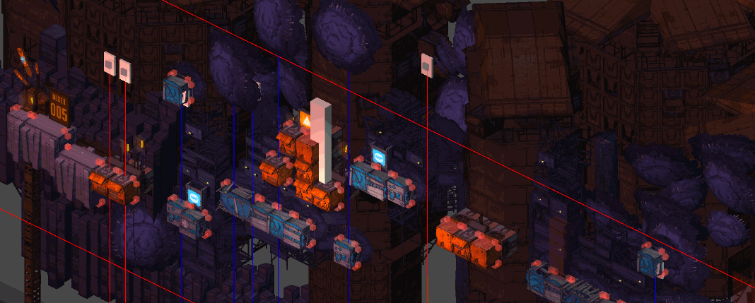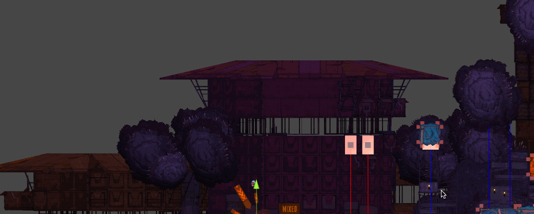 So for actual On Rusty Trails work, Stamm sent me some level insights. The first one is an overview over a scene in the Mixed area between Spike and Hairy. We switch from a birds-eye-ish perspective to the in-game frontal point of view.