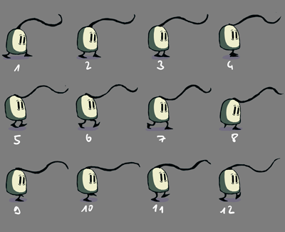 First, you can see the 12 single steps, which the walking cycle is comprised of. This is basic animation work, as you would see it in animated films, and games. The feet/legs and hair are in different positions for every step.