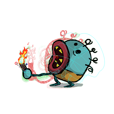 The next step is a rigged version. This means, Tobi adds “bones” to the character, which he can move around for animation. As you may know, Tobi comes from animation films and has spent quite some time on animating things. He told me, he found the best way to animate characters for him turns out to be a mixture of classic 2D animation and the rigging. To elaborate: Classic animation is done frame by frame, which you all know from flip books. This process has the big flaw that if the finished animation turns out to be too fast or too slow, for example, you have to start all over again. The combination with the rigged character lets you tweak details of the cycle and is therefore more forgiving.