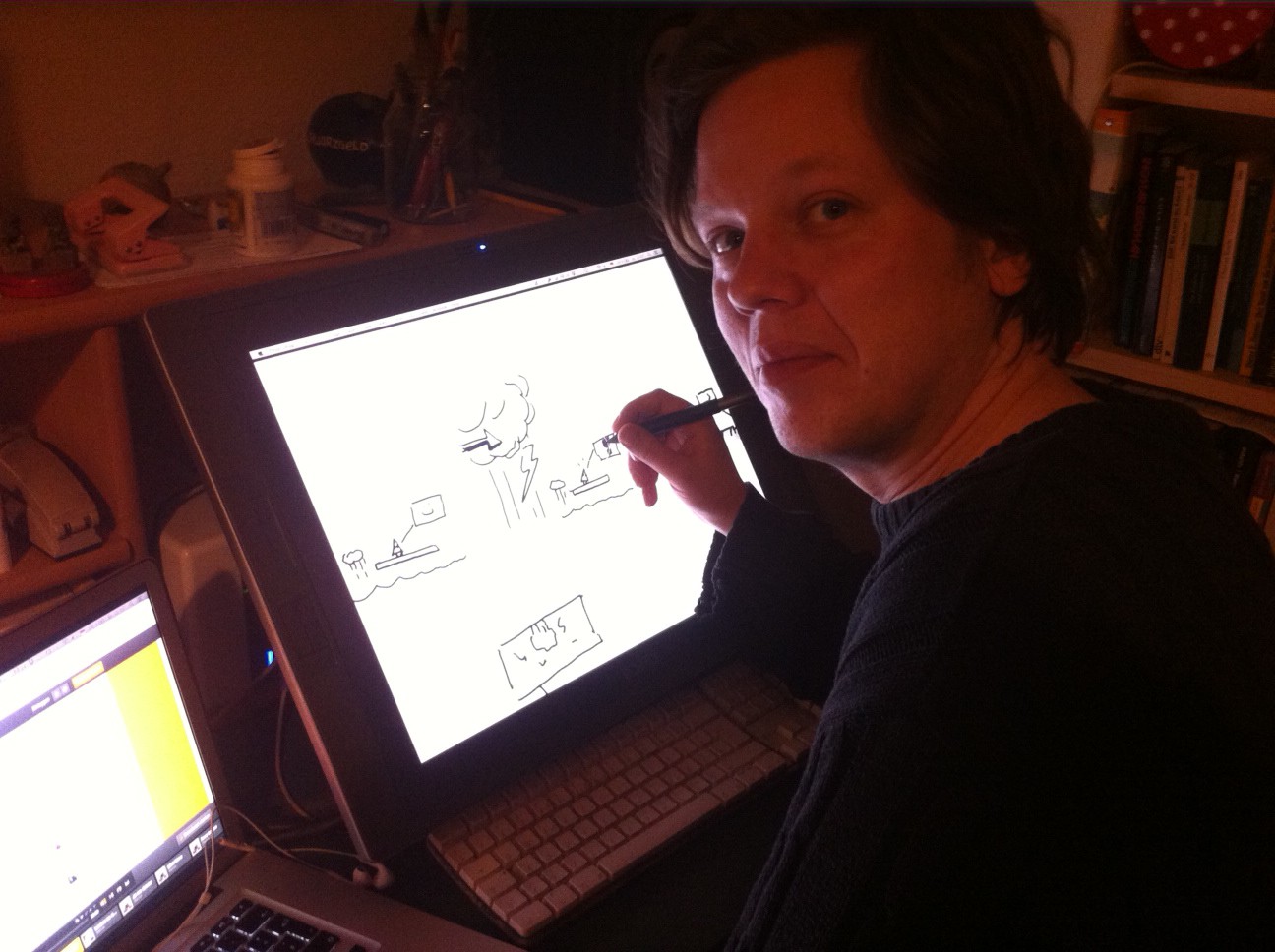 Tobi always contributes some live work-in-progress shots, which is a nice way to look over his shoulder. This picture shows him drawing on the story board for On Rusty Trails: