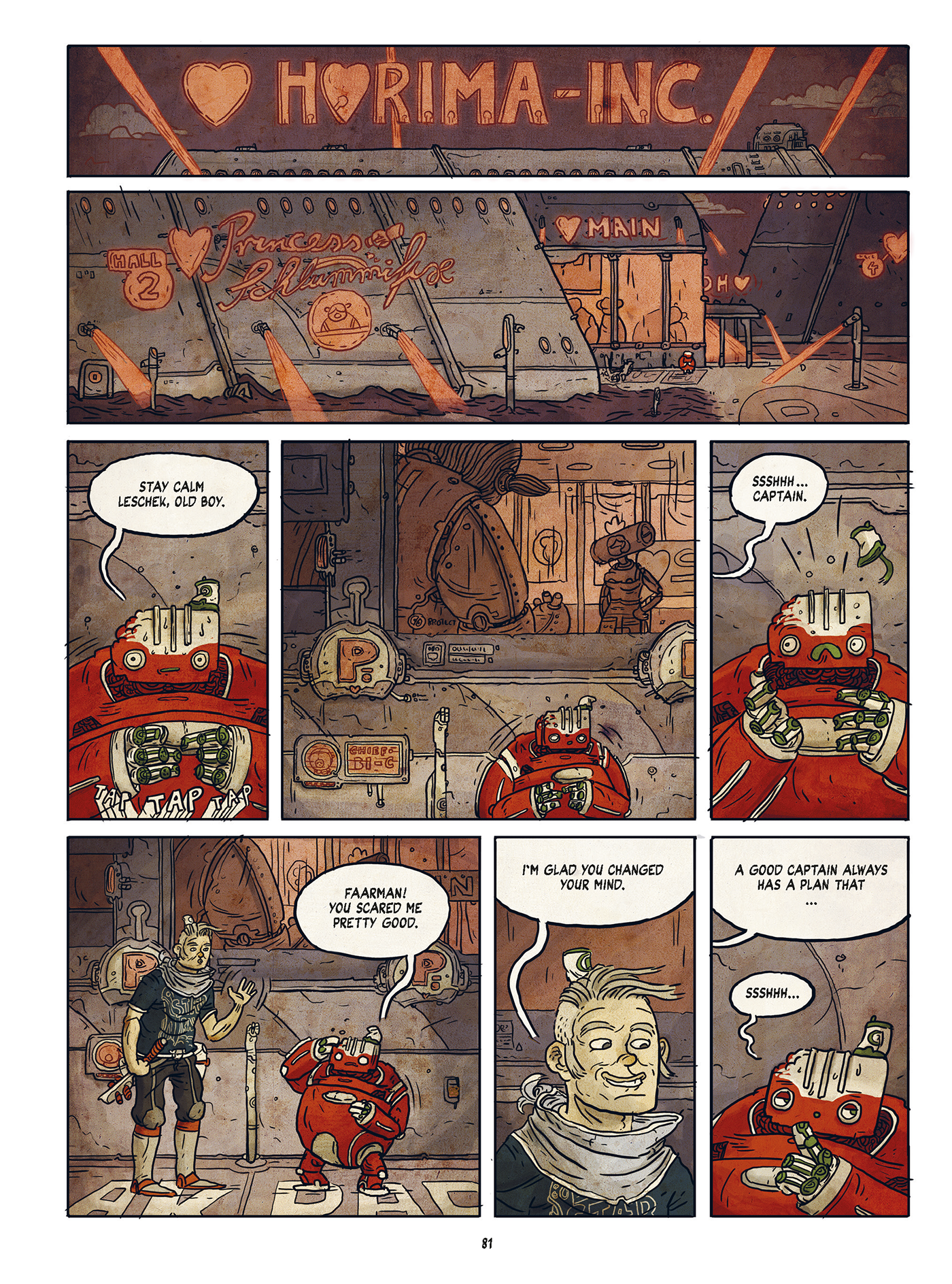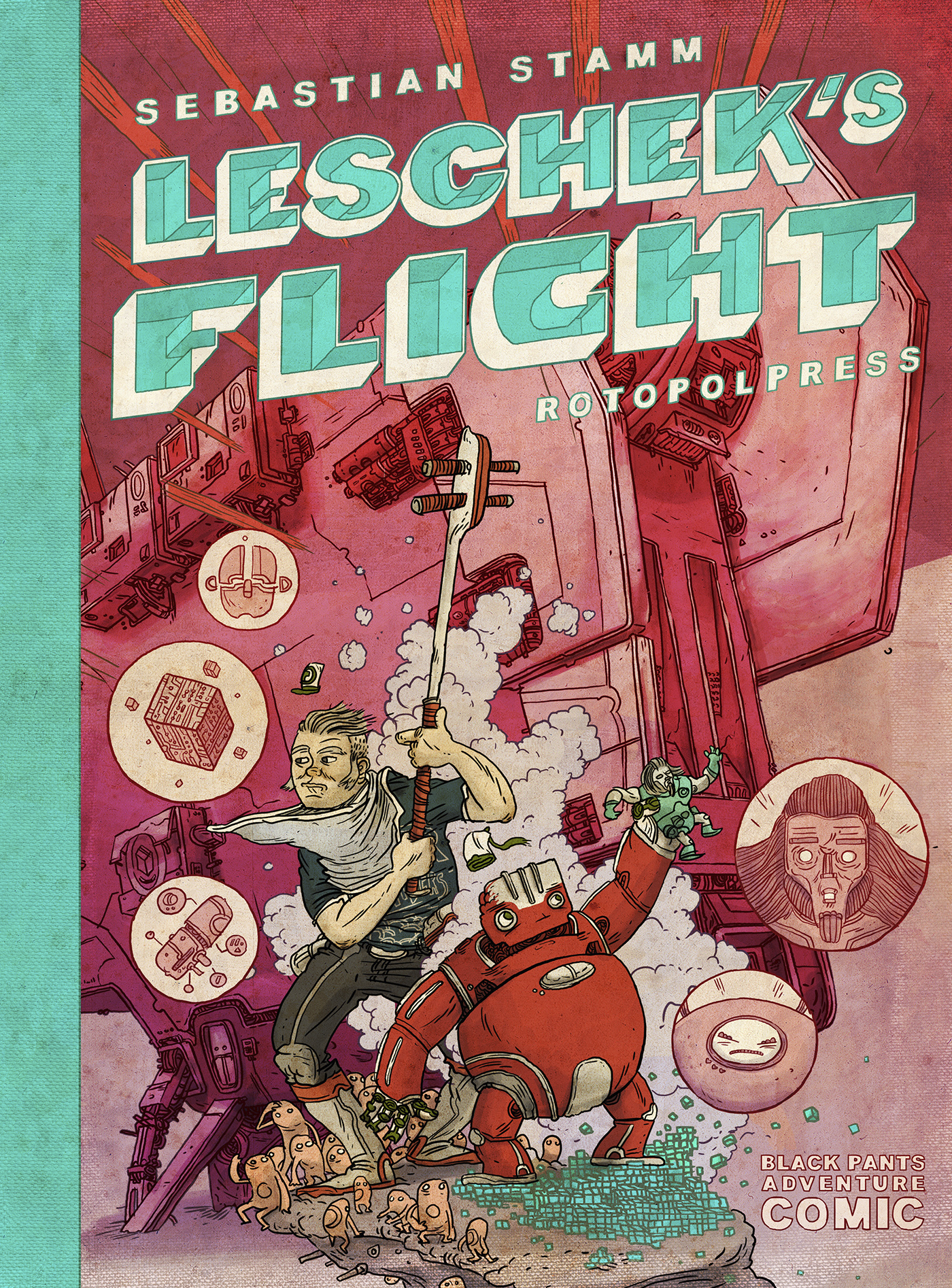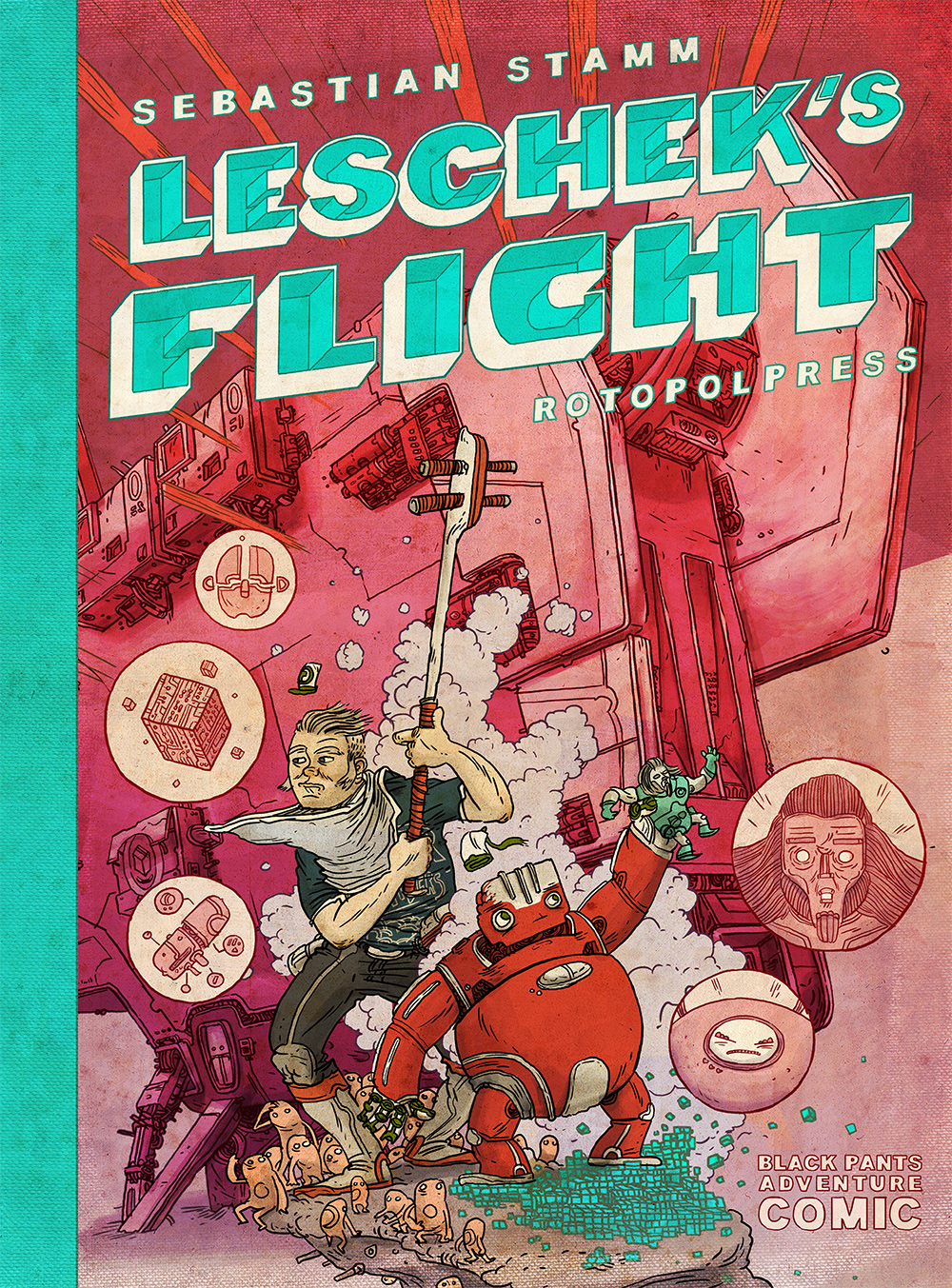 So somewhere in space is Neulins, a dreary and dirty place where the clocks of large factories set the pace. The population has adapted to the harsh climate of this industrial asteroid: Neulins is inhabited almost exclusively by machine people. One of them is Leschek who is just another cog in the gearbox. But the cozy robot is not really dedicated to his assigned task in the toy factory, daydreaming about his own ideas of a multi-function action figure. When his colleague Fattko falls a victim to the final defect, he leaves Leschek a legacy, that could help him escape. But to really escape Neulins in the end, Leschek needs a human associate. The illustrator Sebastian Stamm, creative director and co-developer of the award-winning indie game Tiny & Big, finds an extraordinary action scenario for his comic debut Lescheks Flug (Leschek’s Flight) : an offbeat space adventure, that’s rusting, rumbling and creaking.