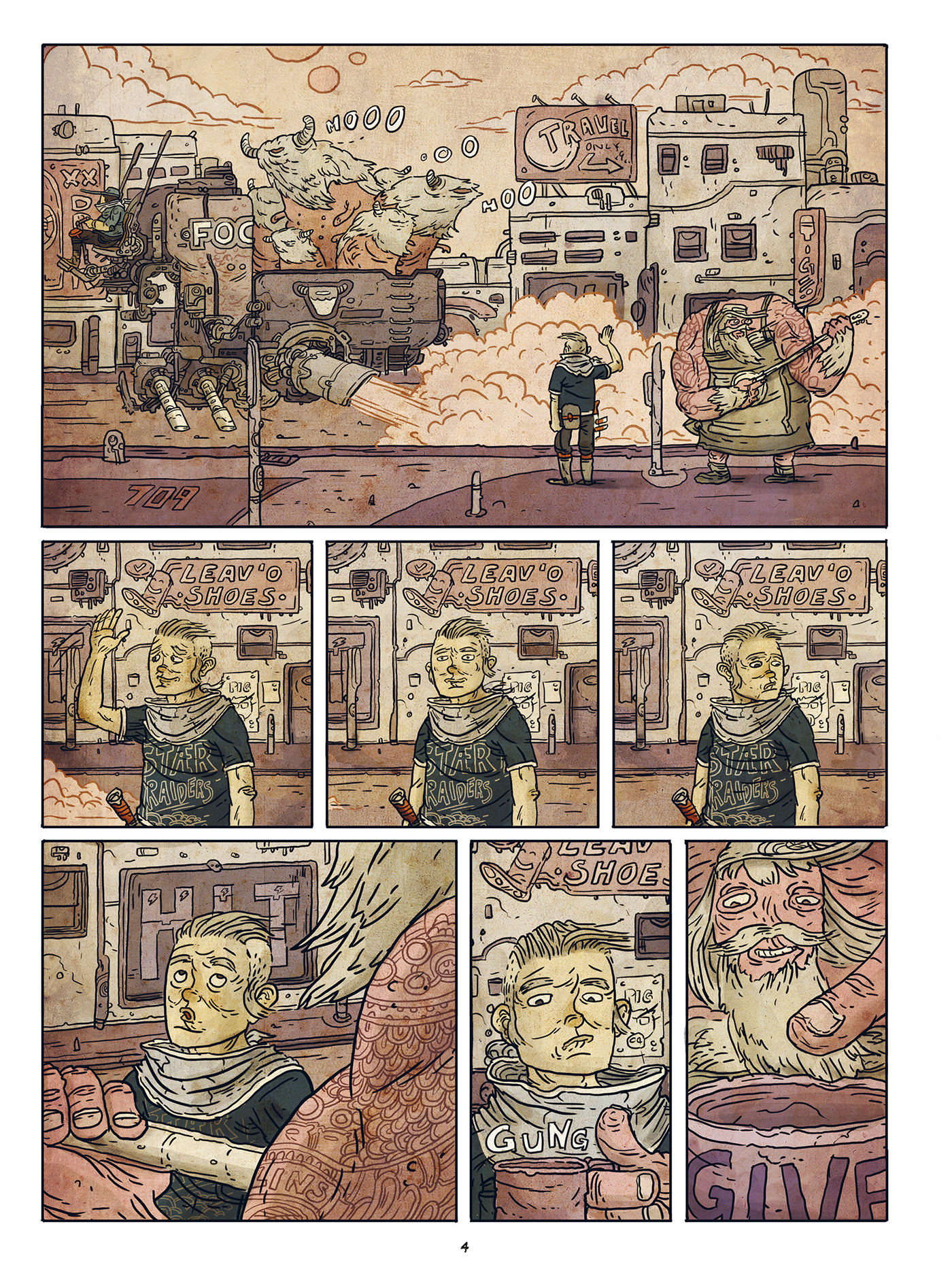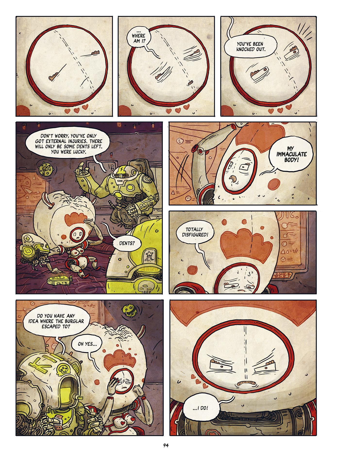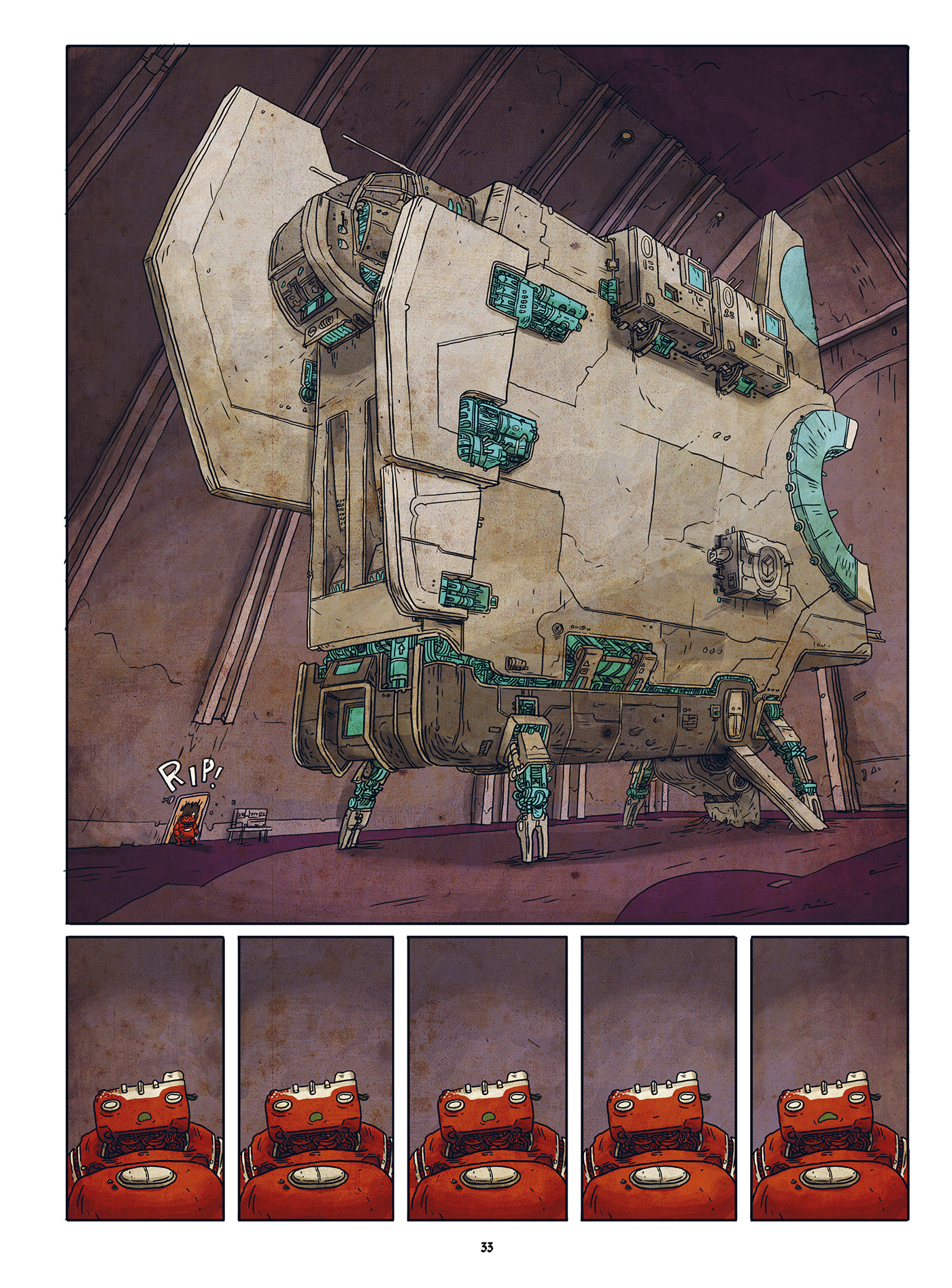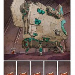 So somewhere in space is Neulins, a dreary and dirty place where the clocks of large factories set the pace. The population has adapted to the harsh climate of this industrial asteroid: Neulins is inhabited almost exclusively by machine people. One of them is Leschek who is just another cog in the gearbox. But the cozy robot is not really dedicated to his assigned task in the toy factory, daydreaming about his own ideas of a multi-function action figure. When his colleague Fattko falls a victim to the final defect, he leaves Leschek a legacy, that could help him escape. But to really escape Neulins in the end, Leschek needs a human associate. The illustrator Sebastian Stamm, creative director and co-developer of the award-winning indie game Tiny & Big, finds an extraordinary action scenario for his comic debut Lescheks Flug (Leschek’s Flight) : an offbeat space adventure, that’s rusting, rumbling and creaking.