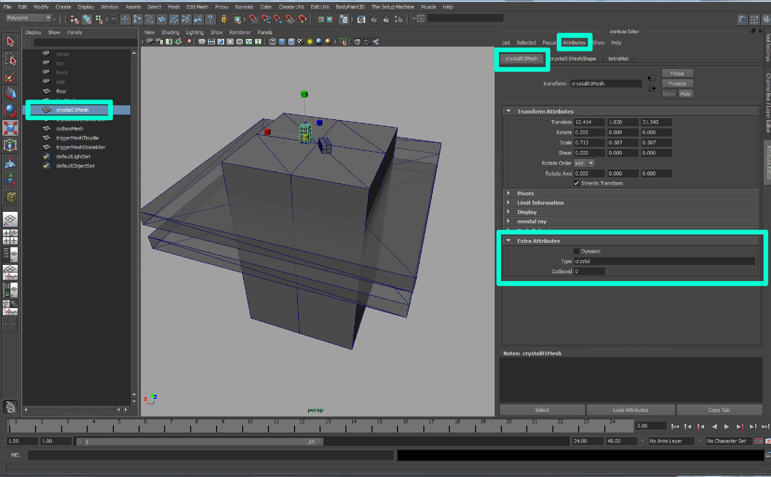 floorMesh By default every polygon mesh you create in maya will appear in the level. The object will be a passive collider, so Tiny and other dynamic objects will collide with and can i.g. walk on it but it can’t be moved around or sliced. The ‘floormesh’ has no additional entries under ‘Extra Attributes’. Now select ‘tinyMesh’.