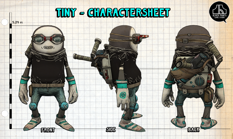 To go along with our redesign post, here's a final character sheet of Tiny in bloom and with equipment loaded. The little mugger has a size of 5.24 real human feet and a shoe size of 11(as a nitty-gritty character, he prefers Velcro® fastener on his footwear). Unless stolen, he normally wears one specific pair of underwear and likes his hairdo to be short. Skin tone is a healthy dark grey. Due to his carefully chosen way of life, you can see his perfectly ball-shaped belly when you look at him in profile.