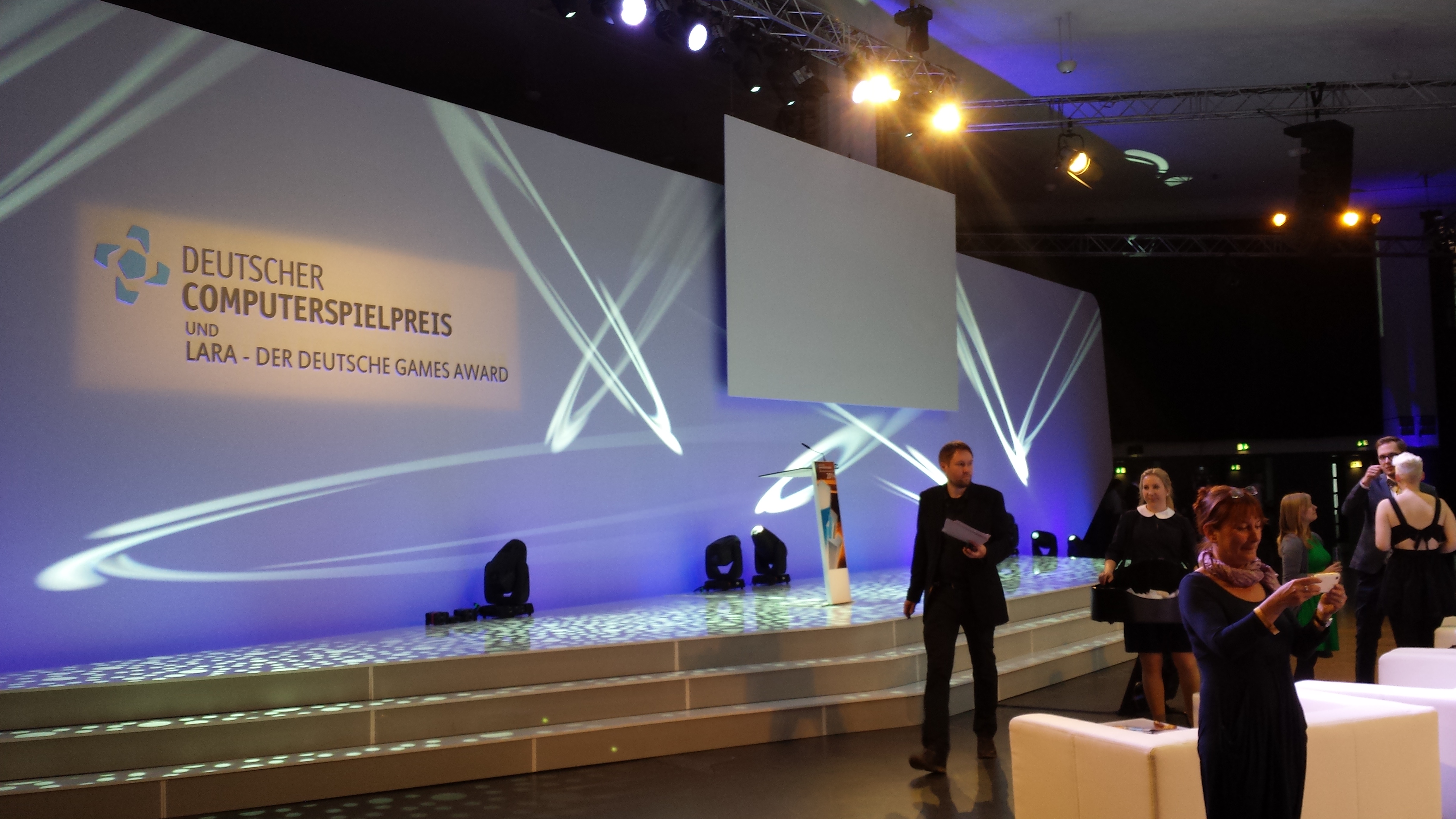Last week our Symmetrain friends Daniel and Philipp plus Christian and I (for Black Pants) went to Munich for the "Deutscher Computerspielpreis" (German Game Award). Symmetrain had been nominated in the category "Best German Mobile Game" and thus was our 3rd game of three to be nominated at the DCP. Sadly it was the first one not to win. We want to congratulate Golden Tricycle and their game CLARC for winning the award.