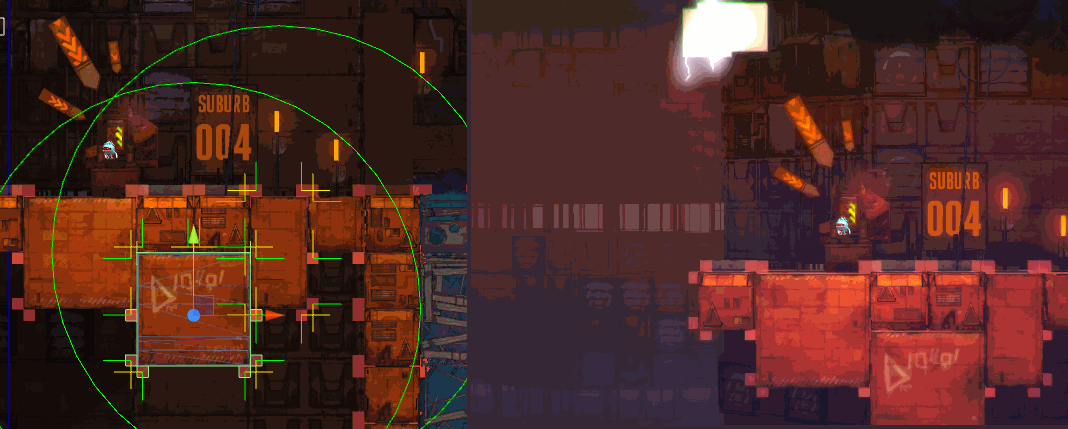 The next one shows, how sometimes stuff does not go the way we had planned. For compositional reasons a level did not fit in the area it was in, so Stamm did a little clicking around and poof, the house switches colors and the level can be placed at a better position.