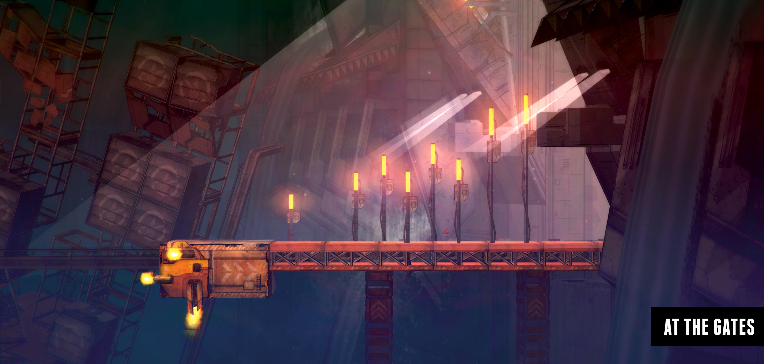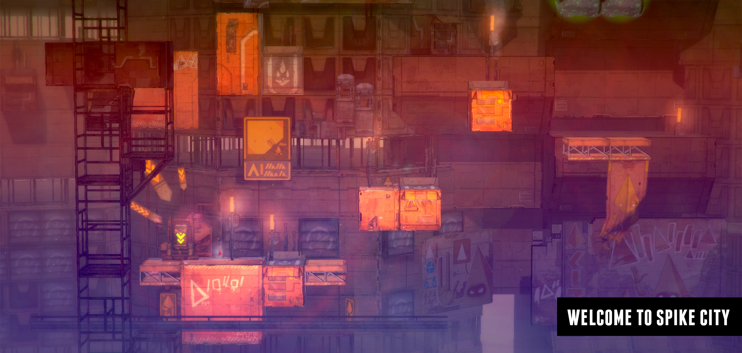 On his way into the city, Elvis passes The Gates, which are the immediate outskirts of Spike City and heavily fortified to keep out intruders. Also still the best lamp lace in the game. On the left you can see one of our moving platforms docking to the next platform.