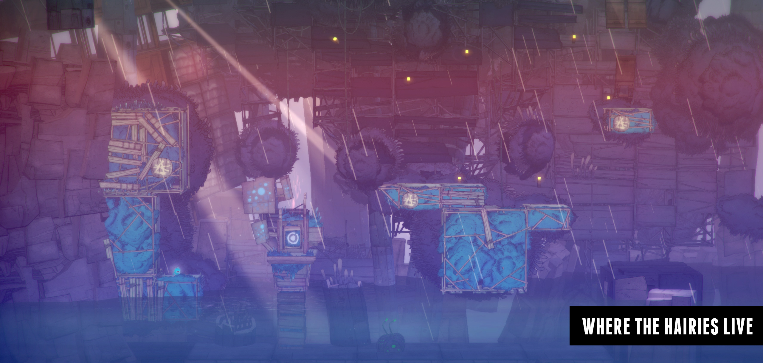 This is the Mixed Land (working title), which is still a part of Spike City, but has always had Hairies as citizens, living next to Spikes. They are a minority, but so far they have been peacefully coexisting in this part of the city. On the left, a group of Spikes is inspecting the situation, discussing the goings on with the dangerous-looking oozing platform on the right side.