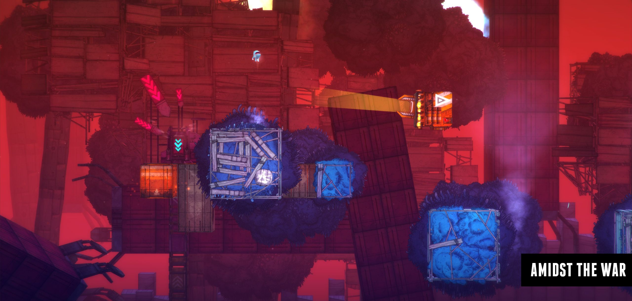 Elvis has reached the War stage of the game and finds himself in the cross hairs of a Spike war machine, since he is wearing his Shifty Suit. Nice catch on the screenshot with the midair position of Elvis' jump cycle. A for style! On the left, we can see some destruction, as parts of the platforms have been ripped off.