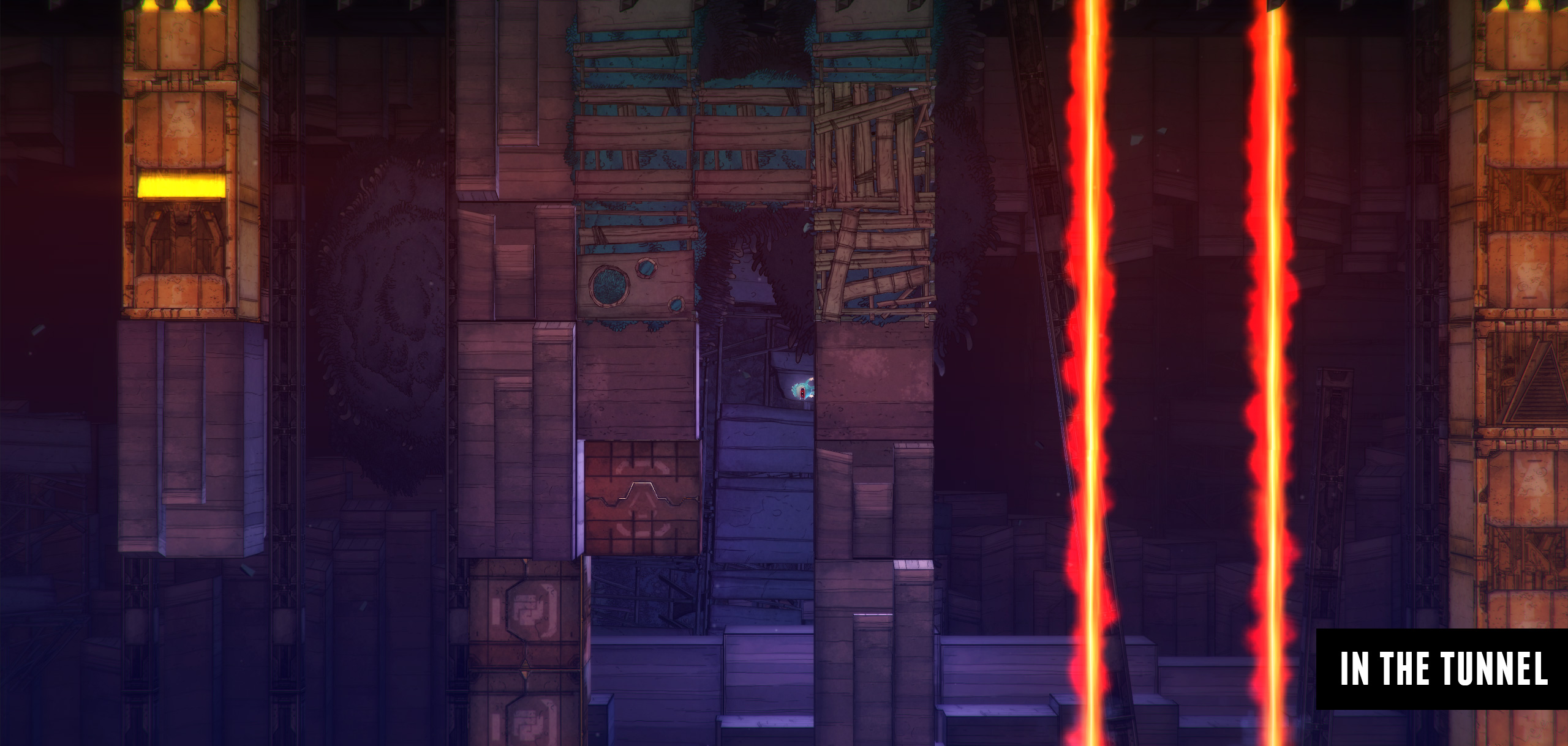 The Tunnel is a transitional area between the Mixed Land and The Factory. The way to The Factory is closed for the public for some reason, so Elvis has to find a way to sneak in. Many platforms in this area are already swampy and only accessible with the Shifty Suit, but those lasers will surely fry Hairy People.