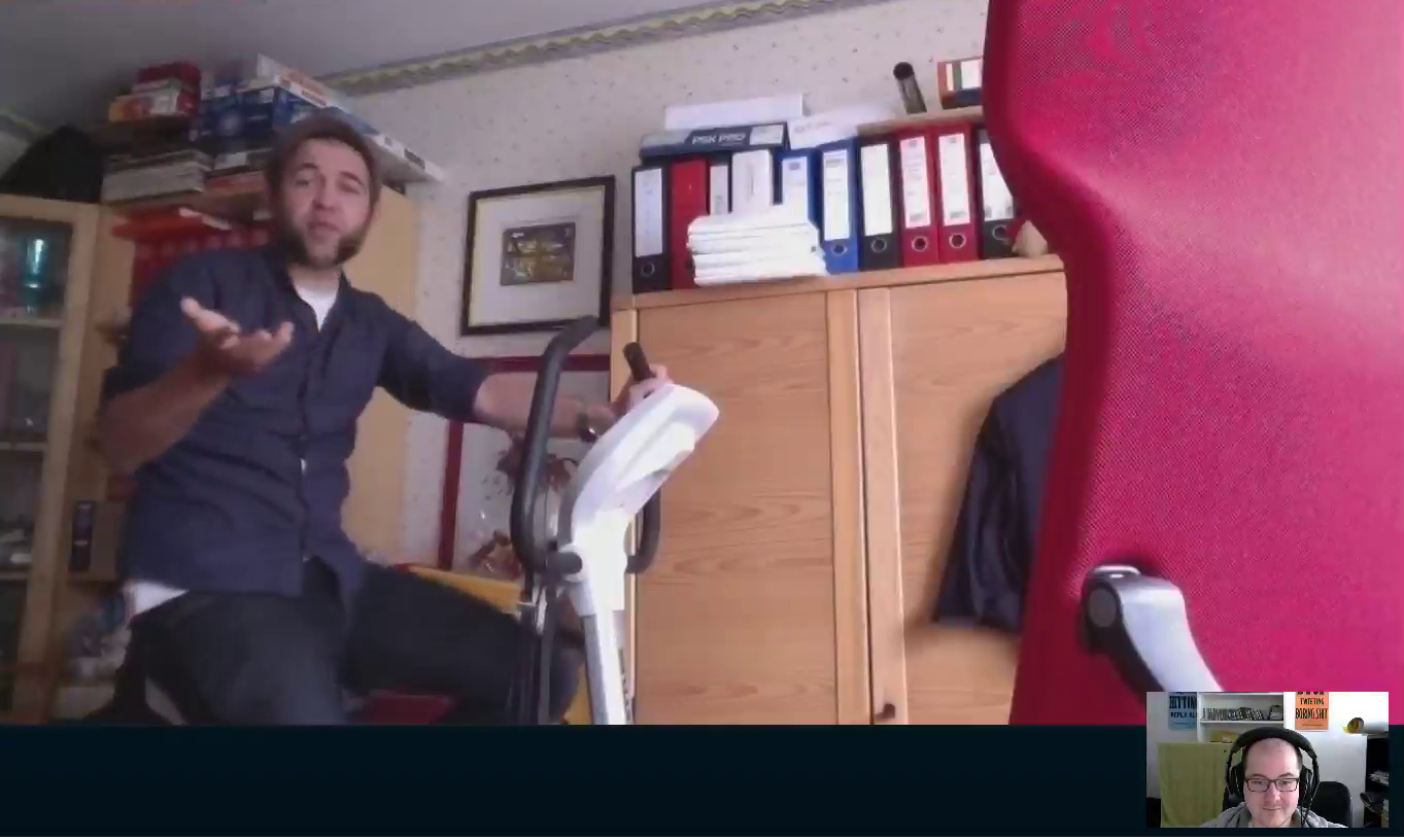 That's it for this walkthrough of On Rusty Trails. (Some secrets still uncovered). For all you patient people, who have stuck with me through the blog, here is the promised bonus picture. Stamm is visiting his grandpa at the moment, so he did the call from there. The room he works in also sports some fine home exercising equipment, so at one point he decided to make use of it. Little did he know, I snuck a screenshot. This is, what I have to put up with on a daily basis, folks. (Sorry for potato quality).