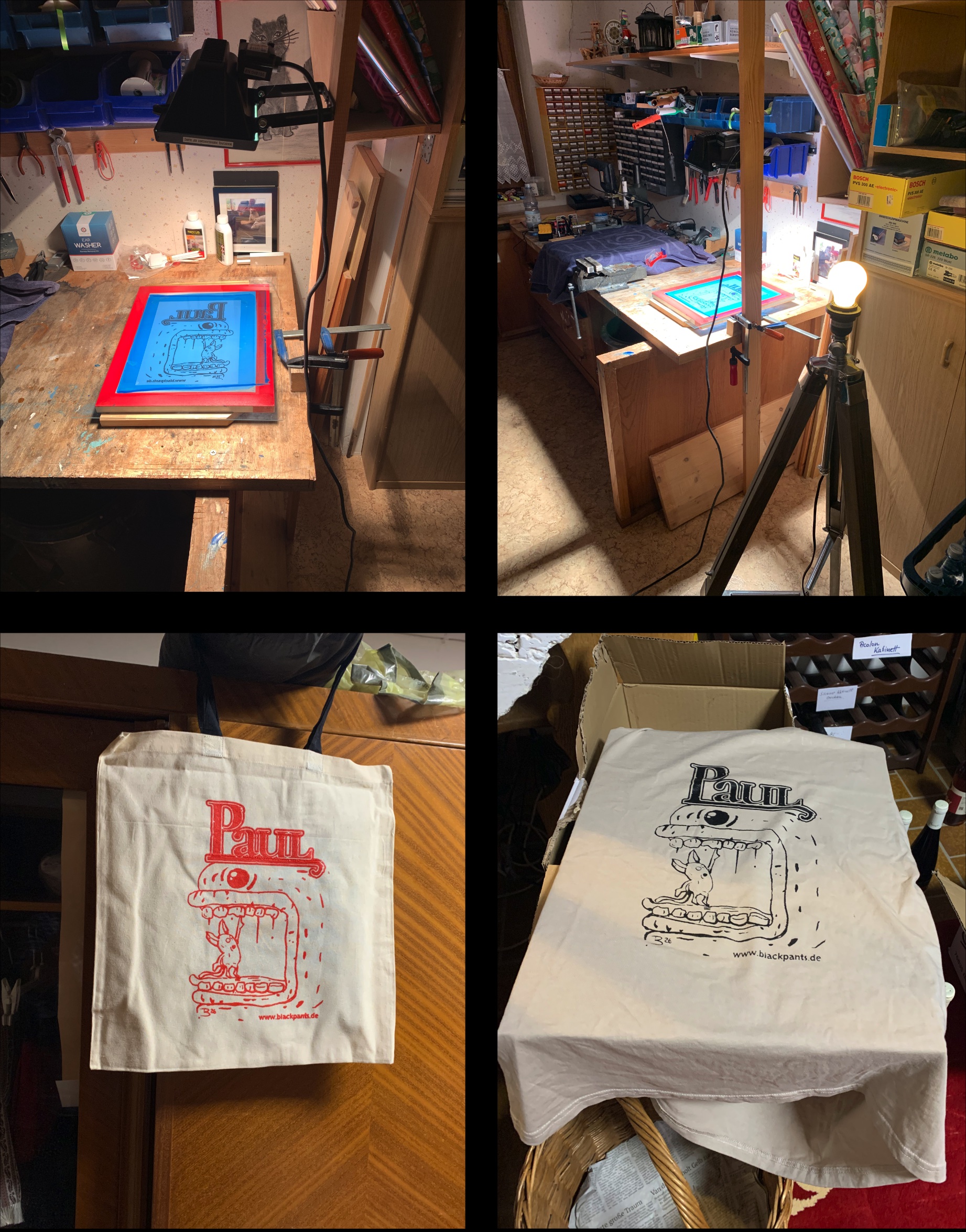 To prevent getting “square eyes” from staring at the monitor all day, I headed down to the basement with my sister to create some Paul T-shirts. The motif was designed a few weeks ago, and I think it looks great on fabric. It’ll likely serve as the basis for the game’s official cover art.