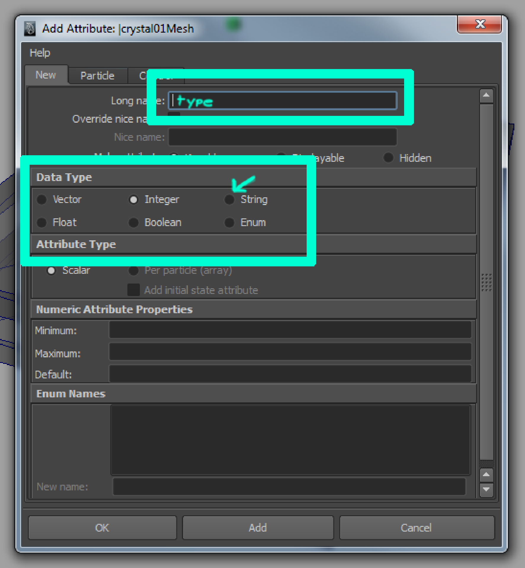 A dialogue will open. For ‘Long name’ choose ‘type’. Under ‘Data Type’ select ‘string’ which means that the attribute will have a text box in which you may enter any chain of strings, like ‘crystal’, ‘tiny’ or ‘yoyoclown’. For the attribute ‘dynamic’ you’d e.g. choose Data Type ‘Boolean’ which creates a false/true checkbox, for ‘cutboxid’ Data Type would be ‘Integer’ which allows you to enter whole numbers only. The new attribute called ‘type’ will appear under the Extra Attributes tab in the Attribute Editor. Type in “crystal”. Congratulations, your imported mesh is now sliceable!
